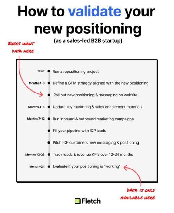Sara Santanen, a positioning consultant at Fletch PMM, points out that B2B sales-led companies need to commit to 18-24 months before fairly evaluating results. Yet most execs want results within 3 months.